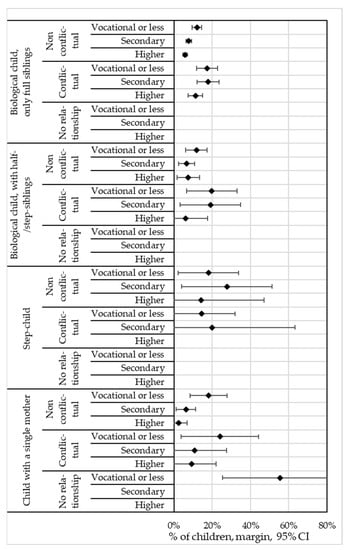 We should note here that the interaction effects from Model 5a are not significant (Table A1), and in all but two cases, this is also true of Model 5b. The risk of socio-emotional difficulties is OR = 0.4 (95% CI: 0.2–1.0) for the children of single mothers with a secondary level of education; and it is OR = 5.5 (95% CI: 1.4–20.6) for children living with both biological parents, but also with step- and/or half-siblings, where the mother has secondary education, and the relationship of the biological parents is conflictual (Table A2).
