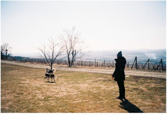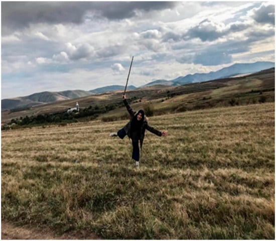 The photos linked with the topic of nature are landscapes depicting the natural beauty of the scenery (Figure 2) or landscapes that also include the migrant herself (Figure 1 and Figure 3). Including themselves in the pictures is a testimony of the migrants’ feeling of belonging to the scenery and to the host country. Locating oneself in the natural setting of the new country is a key feature for the migrants’ willingness to integrate in the host society and for their actual integration [22]. What is more, the author of Figure 1 revealed—during the group discussion following the second art-based session—that, from all her photographs submitted, this precise one was her favorite. These findings confirm previous evidences from the literature [22,23] arguing that placing one’s self in nature-based settings is a key aspect to migrant integration and “the ability to find points of connection with the landscape is central to integration into a new society” ([22], p. 526).