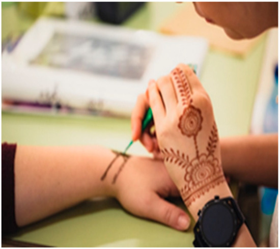 Figure 5 shows a person with a henna design on her hand sitting across another person with her hand outstretched. The person with the henna design is holding a small cone filled with henna paste and is carefully applying it onto the outstretched hand of the other person, creating a tattoo. This picture captures two aspects: the sense of cultural exchange and connection, and the act of sharing the henna application process, which stands for the sense of community and belonging. Henna application is a traditional practice that is part of celebrations and social gatherings in some cultures, as Basas [47] observed. Therefore, this activity is a way of sharing traditions and breaking down the boundaries between two different cultures.