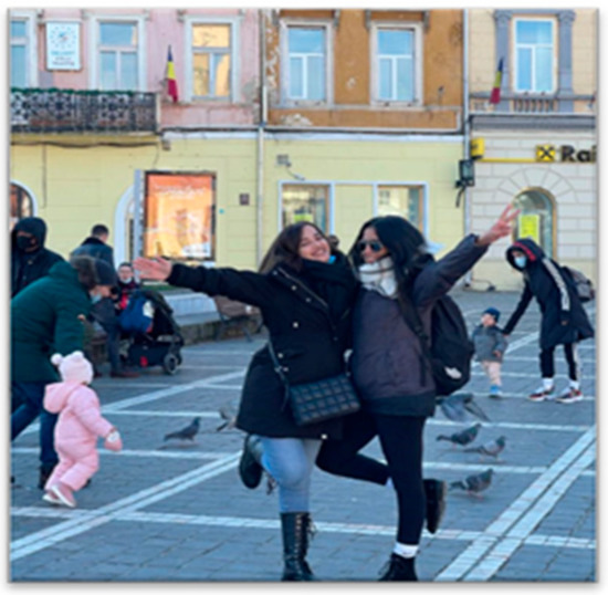 The Romanian community was described by the participants as inclusive, supportive, and accepting of cultural diversity. Figure 6 depicts two girls with smiles on their faces, who are embracing each other with their hands raised up in the air. The image conveys a sense of happiness, friendship, and celebration, suggesting that the girls are relaxed and comfortable in each other’s company. The picture shows the power of friendship and community in bringing people together and creating moments of happiness and celebration. The author of this photograph expressed positive feelings towards Romanians, considering them as open-minded and friendly, making it easy to meet new people and form connections. Also, she mentioned that the strong sense of safety in the country encourages socialization and going out, as people can feel secure walking around even late at night without worrying about their personal safety. The feeling of safeness as a key to faster integration was also mentioned by authors such as Stewart and Mulvey [48] or Kearns and Whitley [49]. This sets Romania apart from other countries where safety concerns may hinder social activities.
