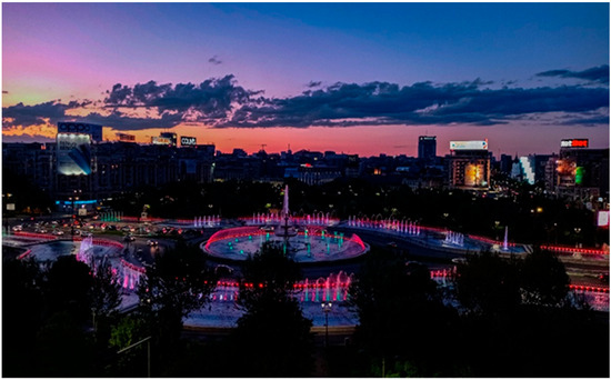 Figure 7 depicts the panoramic view of water fountains at dusk taken from a balcony. The sky above is a stunning gradient of warm oranges, yellows, purples, and ultramarine, indicating that the sun has just set below the horizon. The light from lamps gives the fountains a soft and magical glow, creating a serene feeling of tranquility. The author has effectively conveyed the ambiance of the picture through the narrative and also mentioned the soothing sound of the water, which blended seamlessly with the ambient sounds of nature.