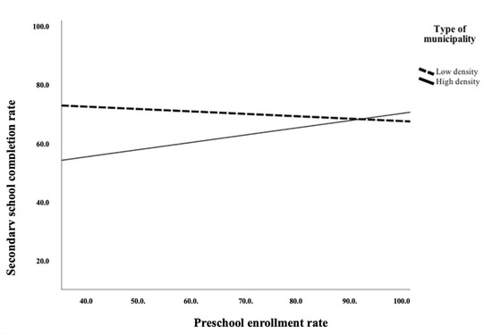 Subsequent examination (Table 3, Model 2) revealed a significant interaction between type of municipality and preschool enrollment rate. In this case, the LMM was significant: Wald χ2 (6, 247) = 15.59, p < 0.000, AIC = 5689.83; BIC = 5731.44. Specifically, we found a considerable increase in secondary school conclusion rates at higher levels of preschool enrollment among high-density municipalities (B = 0.25; p < 0.01). Figure 1 depicts this interaction.
