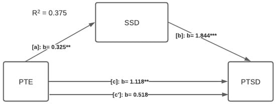 We tested the mediating role of SSD in the relationship between PTE and PTSD. Results show that SSD mediates the PTE—PTSD relationship. The model explains 37.5% of the variance (F (2, 113) = 33.94 p < 0.001), and the indirect effect of this relation is significant (indirect effect: 0.60, SE = 0.22, 95% CI [0.18–1.06]), meaning that SSD fully mediates in the relationship between PTE and PTSD since the direct effect is no longer significant (direct effect: 0.52, SE = 0.30, 95% CI [−0.08–1.12]). Figure 1 shows the coefficient results in the mediation model.