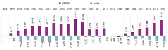 Historical events have added momentum [4] to migration, particularly conflicts, wars, humanitarian crises, and natural disasters. In an attempt to clarify the current situation, Arango [5] pointed out that “rapid and sustained economic growth, the increasing internationalization of economic activity, worldwide decolonization processes and emerging economic development processes in the Third World, brought with them an intensification of migration, both internally and internationally.” Brown and Gort [6] also stressed that globalisation has contributed to the surge in transnational migratory flows, affecting an increasing number of countries. Sandell, Sorroza, and Olivié [7] have coined present-day migratory movements as the “new era of migration”.