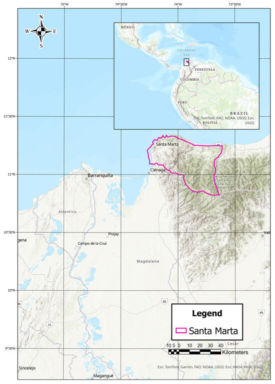 Santa Marta in Colombia’s Magdalena region (Figure 1) experiences significant water supply challenges, with demand exceeding available supply by nearly 30% on average. During dry seasons, this shortfall can worsen to about 60% [44]. Decreased rainfall and lower flow rates further exacerbate the city’s vulnerability to water scarcity. Santa Marta is among the seven areas in Magdalena that periodically declare a public calamity due to water issues, which particularly affect urban zones [45].