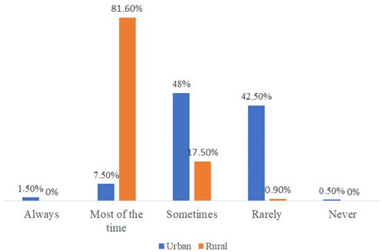 In the context of water scarcity perception, significant statistical differences were found between urban and rural populations (Pseudo-F = 98.572; p-perm = 0.001), while no differences emerged between genders (Pseudo-F = 2.9; p-perm = 0.06) or in the interaction of gender by urban or rural population (Pseudo-F = 0.45; p-perm = 0.63). In the urban area, for the question “Does water reach your home throughout the year?”, the predominant responses were “sometimes” (48%) and “rarely” (42.5%), indicating that the flow is not constant throughout the year. In contrast, for rural areas, a significant majority of respondents (80%) reported that water reaches their homes “most of the time” (Figure 2).