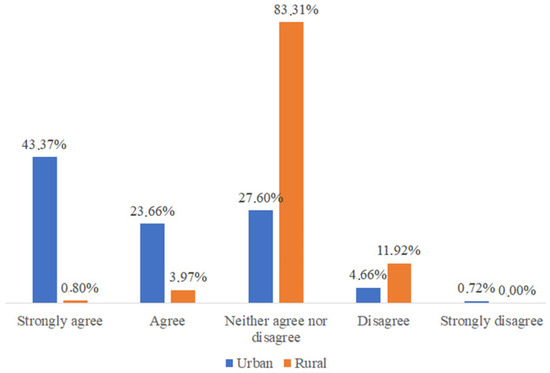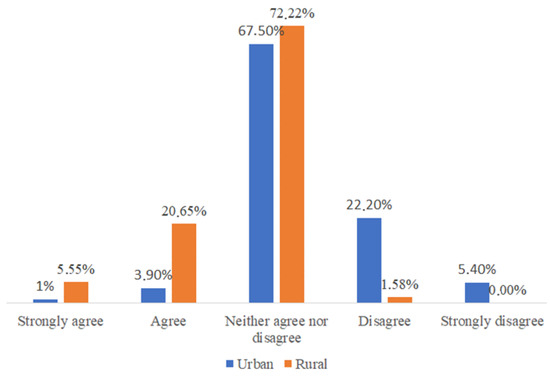 When asked, “Do you think there is enough water for the entire community in your territory?”, the most common response in both urban and rural areas was “neither agree nor disagree”, representing 67.50% and 72.22%, respectively. The respondents expressing a neutral position reflected uncertainty and variability in experiencing water accessibility and supply. In the urban area, this perception may be influenced by population growth and inadequate infrastructure maintenance, hindering a sufficient water supply for the community. However, in rural areas, factors such as seasonal variations and proximity to natural water sources could impact viewpoints on this matter (Figure 3).