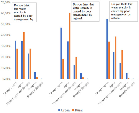 Significant statistical differences were found between urban and rural populations (Pseudo-F = 15.595; p-perm = 0.001) in relation to the questions concerning water management. No differences were found between genders (Pseudo-F = 1.24; p-perm = 0.277), nor in the interaction of gender by urban or rural population (Pseudo-F = 0.18; p-perm = 0.78). The survey results indicate a clear consensus among respondents regarding water management inefficiencies across various levels of government (Figure 5). Most participants believe that local, regional, and national governments are managing water resources poorly, directly contributing to ongoing water scarcity in their territory. These beliefs were consistently strong across different demographics and localities, demonstrating widespread dissatisfaction with the current state of water management. This consensus highlights the public perception that mismanagement and neglect by governmental bodies at all levels are primary drivers of the water scarcity crisis in their communities. This critical perspective toward governmental management emphasizes the urgent need to reform policies and practices related to water management to address the root causes of water scarcity and restore public trust in related governmental actions.