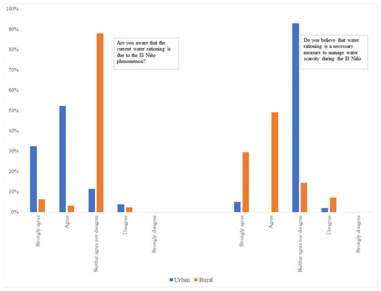 This study provides a nuanced perspective on community awareness of the El Niño phenomenon, revealing differences between urban and rural areas. As expected, urban residents demonstrated greater awareness of the relationship between El Niño and current water rationing. This aligns with the understanding that urban populations have better access to technological resources and information related to climate change. However, rural inhabitants expressed neither agreement nor disagreement regarding the cause of water rationing. This reveals a significant gap in communication and awareness, not solely due to a lack of access to technology but potentially due to the absence of targeted information dissemination strategies in rural areas. Furthermore, while urban residents largely viewed water rationing as necessary during El Niño events, rural communities maintained a neutral stance. This contrast highlights a disparity in understanding the rationale behind resource management decisions. The findings suggest that enhancing communication and education in rural areas, tailored to local contexts, could improve overall awareness and community engagement with water management practices during climate events like El Niño [60]. Thus, while urban areas benefit from better information, the study underscores the need for more equitable information dissemination, especially in rural regions, to close the gap in climate change awareness and water resource management.