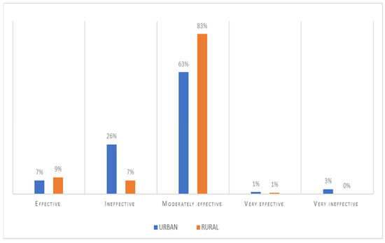 Regarding the question “How would you rate communication from the authorities about the reasons for water rationing and how to manage it?” both urban and rural respondents expressed overwhelmingly neutral opinions, with 177 (63%) and 105 (83%), respectively, considering the authorities’ management to be moderately effective. In urban areas, responses were as follows: 11 effective (9%), nine ineffective (5.73%), 86 disagree (30.83%), and one strongly disagree (0.36%). In rural areas, 11 selected agree (8.73%), two selected disagree (1.58%), five selected strongly agree (3.97%), and zero selected strongly disagree (0%) (Figure 7). The neutral survey responses suggest a lack of strong public opinions about communication on water rationing. This indicates a need to improve how information is shared with the public. Ensuring accessible communication for all residents, especially in areas with limited access to information, remains a key challenge for effective water management.