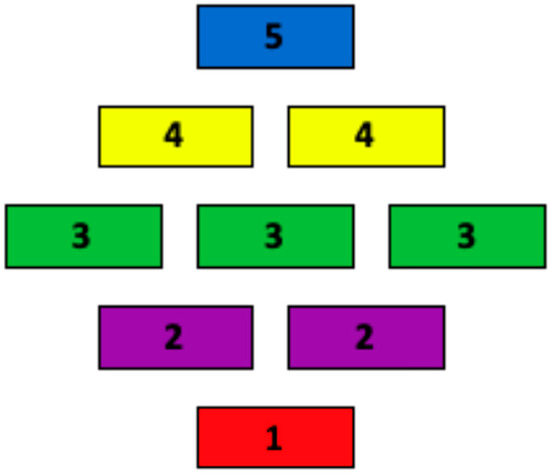 In each group, participants created nine cards and were asked to place them on the Diamond9 board, with the most important issue to address in SCHs at the top and the least important at the bottom. Cards placed on the same row were given the same weight of importance, as indicated by the colour on Figure 1, and the final diamond presented the researcher with the opportunity to explore the relationship between different elements. Each line on the board was given a numerical number for analysis, with five for the top and one for the bottom. The Diamond9 was used to explore what is not working well currently in SCHs. There was no specific focus at this point on the design and build aspect of the research, as we explored whether participants would address this issue organically without prompting or influence. To analyse the Diamond9 data, each section of the board was allocated a value, as shown on Figure 1 [58].