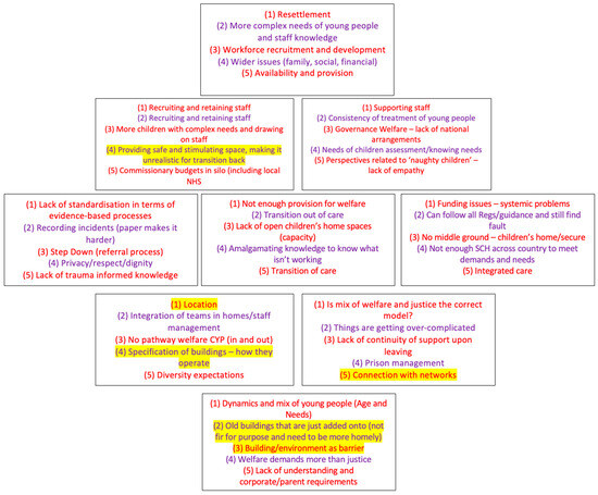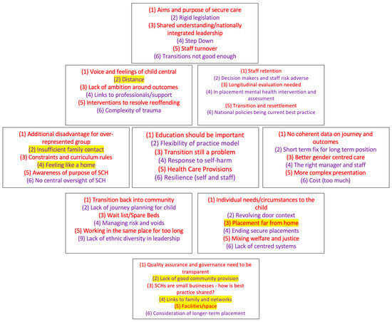 The Diamond9 visual research model originates from primary education research. It has been described as a “thinking skills tool” [54] designed to “encourage discussion about the relative importance of certain factors” [55]. The important aspect of the Diamond9, however, is not necessarily the final position of what is being explored, as there is no right or wrong answer. The importance is the “process of discussion, negotiation, accommodation to other perspectives, and consensus-seeking that takes place in agreeing the ranking” [56]. This methodology captures comparisons and distinctions made across the different categories under discussion and enables researchers to observe their overarching relationship to each other [57]. The Diamond9 tool allowed individuals with different roles and backgrounds to come together and prioritise challenges. This aligned with our purpose of discovering the common and most salient issues in secure care.
