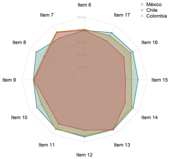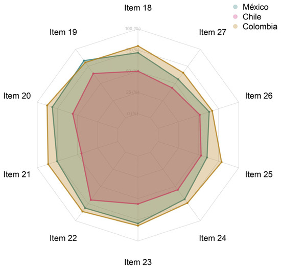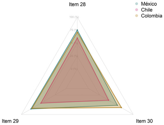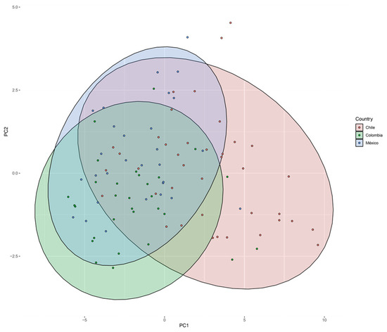 The principal component analysis allowed for transforming the original variables into a new set of variables characterized by correlation. Taking into account all the questions, it can be confirmed that Mexico and Colombia are very similar. However, Chile tends to be different, diverging from the fulfillment of self-determination (Figure 17).