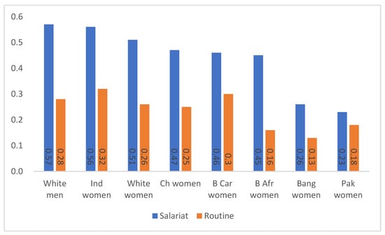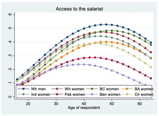 Being able to set a foothold in the job market is the first step, and gaining career progression is a more difficult task. Figure 5 shows the data on access to professional-managerial (salariat) positions. Here, we again find a familiar pattern, namely, occupational success follows a curvilinear function of age. Goldthorpe (1987: 52) [10] stated that people tend to achieve ‘occupational maturity’ at age 35, after which decisive long-range downward mobility is rare. We can see from the figure that this prediction works very well for White men but is much less accurate for the four Asian women groups. Even at the peak of their careers, Bangladeshi and Pakistani women’s likelihood of achieving salariat positions was less than half that of White respondents, holding constant the confounding factors. Even the most educationally qualifed groups (Indian and Chinese) were way behind their White peers. Black Caribbean women tend to work in the NHS as nurses (lower salariat) and hence have a fairly high level of salariat position (Heath and Li, 2008: 279) [46].