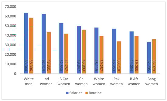 Intersectional analysis of earning power of ethno-gender groups in Class 1 from higher salariat and routine families. Note: controlling for age, age squared, nativity, education, disability, region and year of survey.