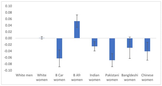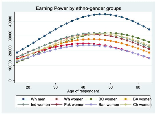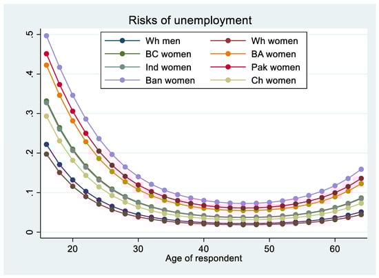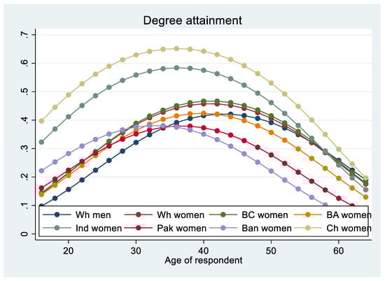 In this part, we present data on the ethno-gender effects over the life course. The data in Figure 3, Figure 4, Figure 5 and Figure 6 show the net differences in the four domains—degree attainment, unemployment risks, access to the salariat and earning power. We follow Li and Heath (2018) [44] in presenting the net effects. Age is one of the protected characteristics under the Equality Act of 2010, and it is against the law to discriminate against people on the basis of age. Yet, age is also a marker of experience and human capital and, as such, age difference in education and labour market achievement is something to be expected. The key question for our present purposes is whether there are notable differences for the ethno-gender groups at similar ages in the four domains after we have taken account of all other influential factors and, if there are, to what extent and how to explain them.