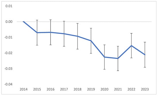 Figure 7 shows the parameter estimates together with the 95% confidence intervals for the changes in the origins–destinations associations from 2014 to 2023. Overall, the line is going down, suggesting an overall improvement over the decade in the mobility structure, or greater social fluidity. This trend was clear but failed to reach statistical significance of 5% in the first few years. Yet, from 2018 onwards, the trend accelerated, and all parameters were significantly different from that of 2014. Taking all 11 years as a whole, the analysis shows clearly a profile of increasing social fluidity in British society. The evidence here reinforces the findings reported in Li and Heath (2016: 189) [18], where the authors showed significantly growing fluidity from the 1980s to 2010s, and we have extended the trend to the 2020s. And our findings here are also in line with the report of growing fluidity by Goldthorpe and Mills (2008) [49], Li and Devine (2011) [50] and Buscha and Sturgis (2018) [37].