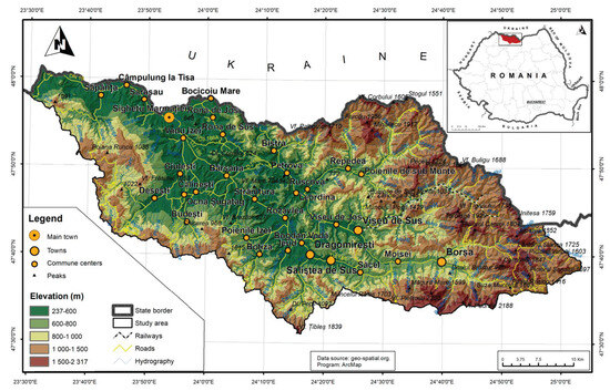 The regional system of the Land of Maramureș stands out as a distinct presence in the northern part of the Eastern Carpathians of Romania. It is delimited by the line of the highest peaks of the Gutâi–Țibleș–Rodnei–Maramureșului mountain range (with a few exceptions), to which the course of the Tisza River from the Vișeu Valley to Teceu is added [43]. The morphological element with a central and polarizing function of the mass, energy and information conveyed in this complex geographical system is the Maramureș Depression (Figure 1).
