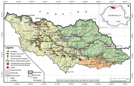 Therefore, the existence of a large number of scientific studies that have focused on various elements within the analysed area (some highly detailed) facilitated our approach to identifying the main vectors defining the personality of the Land of Maramureș. While several elements contribute to the construction of the region’s identity, we consider the ones listed and argued in this study to play a decisive role in this regard, namely (Table 1): the Maramureș Gate; the Rodna Mountains; the Wooden Churches; the “Mocănița” railway in the Vaser Valley; the Maramureș Mountains; the Merry Cemetery in Săpânța; Bârsana Monastery; the Memorial to the Victims of Communism Resistance; the Maramureș folk costume; Outstanding Historical and Cultural Individuals; and the unique Pottery from Săcel.