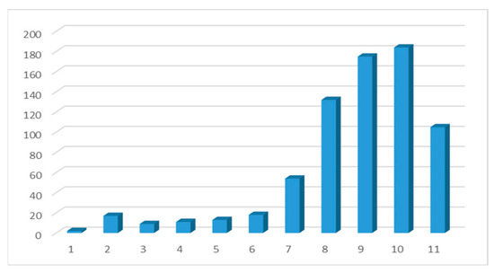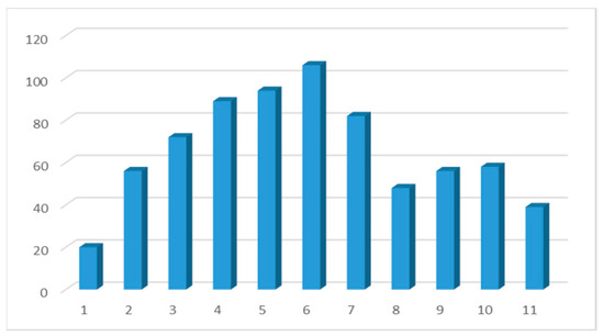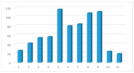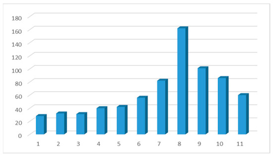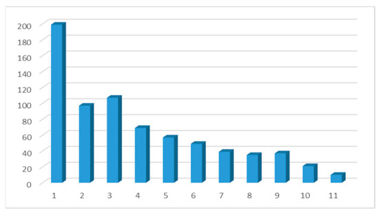 Respondents attribute the last three places in the hierarchy of elements shaping the Land of Maramureș regional identity to two mountain ranges (Maramureș Mountains, ninth place, and Rodna Mountains, eleventh place) and a well-known craft, namely the Săcel pottery, tenth place. While the respondents’ answers suggest that the two mountain ranges play a certain role in shaping the regional identity, their precise relevance to it remains rather difficult to be expressed in concrete terms. A total of 169 respondents place the Maramureș Mountains in ninth position (Figure 17), while another 116 consider they should be ranked last. Regarding the Rodna Mountains, 160 responses rate them eleventh (Figure 18) while 134 consider they should come last. In total, 184 respondents position the Săcel pottery (Figure 19) in tenth place in the hierarchy (Figure 20), whereas 105 respondents rank it last. On the other hand, the number of those viewing these three identity elements as utterly important is really insignificant when compared to the total number of responses. In the case of the two mountain ranges, it is relatively straightforward to analyse, understand and explain the respondents’ perception regarding their significance (less common elements are less readily accessible; regarding the Rodna Mountains, they only partially belong to the analysed region; some peaks of the Maramureș Mountains face towards the neighbouring country, Ukraine, which is currently in conflict, etc.). However, when it comes to the Săcel pottery, a similar undertaking proves rather challenging as this pottery holds a unique status both nationally and across Europe, owing to its production technique, the antiquity of the phenomenon, the uniqueness of the kilns and the fact that very few producers remain.