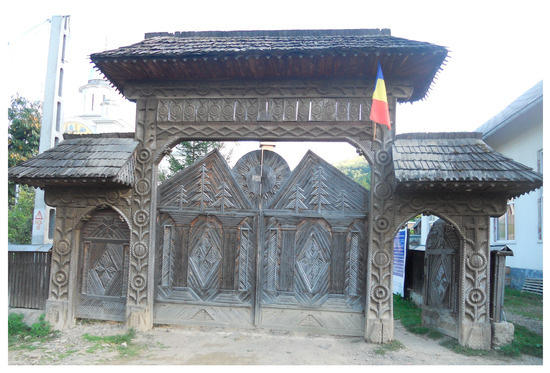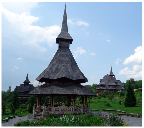 We, the authors of this material, appreciate the fact that at the top of the hierarchy, there are four identity elements belonging to the religious, ethnographic and cultural domains, because these are the main values through which the Land of Maramureș has established itself at a national and international level during its long existence. The wooden churches (Figure 4.), unique in the world, along with the architecture [64] and distinctive features of the Maramureș gates as well as the unparalleled beauty of the traditional folk costumes are recognized worldwide, valued as such in the literature and cared for accordingly in the restoration and preservation process. These elements are significantly complemented by the memory of outstanding historical and cultural individuals native to this land who made famous the region itself and Transylvania as a whole.