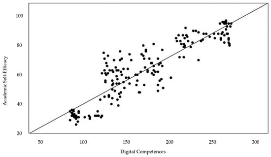 This study also explored the relationship between problem-solving and academic self-efficacy. A coefficient of 0.716 was obtained, and the result is in agreement with [25], who found a positive correlation between problem-solving and self-efficacy in older adults. The results also align with [19], who reported a significant positive correlation between self-efficacy and problem-solving (rho = 0.341). In the academic context, self-efficacy relates to students’ perception of their ability to perform academic activities [12,15,16]. This perception influences their behaviors and emotions, affecting their self-efficacy [13,44]. In an increasingly digital world [1], digital competence, which involves the critical and creative use of information and communication technologies [2,5], becomes a crucial factor in measuring academic self-efficacy. The present research theoretically corroborated this relationship, demonstrating a positive and significant correlation between digital competencies and academic self-efficacy, with a Spearman’s rho of 0.825 and a p-value of 0.000.