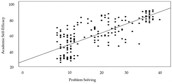 Finally, with regard to Specific Hypothesis Test 5: During the year 2023, an analysis was conducted at Selva Central University to assess how problem-solving ability was related to students’ academic self-efficacy. A null hypothesis (H0) was presented stating that there is no significant relationship between these two variables, while the alternative hypothesis (H1) posits the opposite, that is, it postulates the existence of a significant relationship. To investigate this relationship, Spearman’s correlation coefficient, a non-parametric statistical test suitable for this type of analysis, was used. According to Table 19, the results reveal a correlation coefficient of 0.716, indicating a significant positive correlation between problem-solving and academic self-efficacy. The p-value obtained is less than 0.05, indicating statistical significance. The null hypothesis (H0) is rejected and the alternative hypothesis (H1) is accepted due to the significantly low p-value. This suggests that there is a statistically significant correlation between problem-solving skills and students’ academic confidence. Specifically, a relationship is found between having better problem-solving and problem-approaching skills and feeling more competent in the academic environment. A scatter plot showing this relationship can be seen in Figure 8, highlighting the positive effect that problem-solving competence has on academic self-efficacy. It is essential to promote problem-solving skills in the educational environment, as this can have a significant impact on students’ self-confidence and ability.