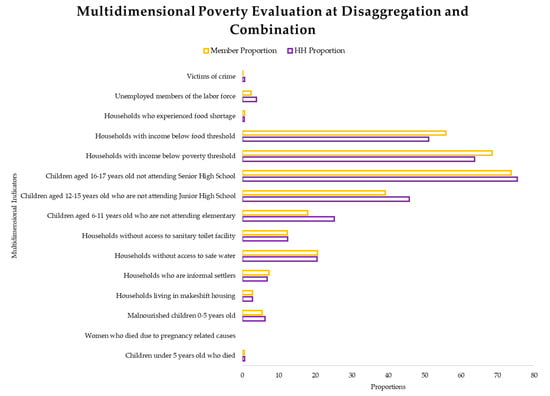 The Multidimensional Poverty Index (MPI), which considers the three aspects of poverty—health, education, and living standards—examines the general situation of underprivileged children worldwide. The CBMS-MPI technique makes it possible to include more indicators of poverty for a deeper examination of poverty and a better understanding of development conditions, especially for children [37]. Comparisons of multiple dimensions of poverty can be responsive to the choice of welfare indices, the aggregate poverty measure utilized, and the weights given to the indicators [46]. The Philippines’ poverty rate was determined in 2003, and over this time, there has been a minor decline in what is considered to be reasonable rates of economic growth. The prevalence of poverty has declined in recent years, most notably in 2015.
