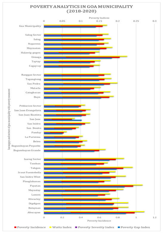 Bicol region is the poorest region in Luzon, and Camarines Sur is the poorest province in the Bicol region, with a poverty incidence of 38.7% [29]. The research seeks to quantify the insurmountable poverty problems in the Bicol Region (V), notably in the province of Camarines Sur. The national poverty data are usually holistic in nature and intended for macroeconomic purposes that cannot be used effectively in designing policies for poverty alleviation and economic development for a specific municipality with diverse characteristics. Through the application of economic analyses and econometric modeling in conjunction with data analytics and informatics, the research project aims to capture the multidimensionality of rural poverty from the microeconomic perspectives of Goa, Camarines Sur. In light of the aforementioned, it is essential to measure poverty in order to properly target programs for reducing poverty and developmental activities for the socioeconomic upliftment of Bicolanos. Goa, Camarines Sur, is host to a significant number of impoverished people. They must alter their way of life if they want to stop being impoverished. They should be a priority for the government at all times, not only during their political careers. The purpose of the study was to look into the causes of poverty in the Municipality of Goa, Camarines Sur, over time. Additionally, this study is going to search for strategies to reduce the various types of rural poverty that the residents of the aforementioned municipality are now dealing with, particularly during this pandemic and through the passage of time.