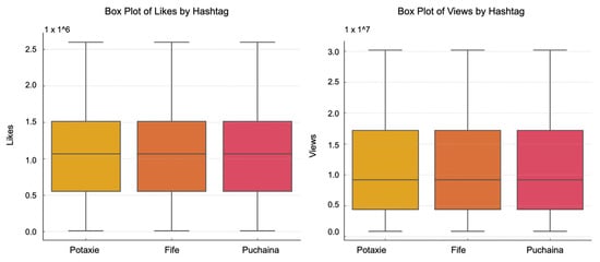 The boxplot (Figure 1) summarises the distribution of “likes” and views of a reference word (hashtag): #Potaxie; #Fife; #Puchaina. Further details are available at: https://doi.org/10.6084/m9.figshare.26362693 (p. 1).