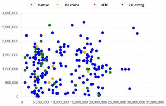 Additionally, a scatterplot (Figure 2) displays the relationship between “likes” and views for #Potaxie, #Fifes, and #Puchaina, revealing high variability in “likes” for videos with similar view counts. This finding highlights that user engagement is influenced by factors beyond view count alone, such as content quality and interaction style.
