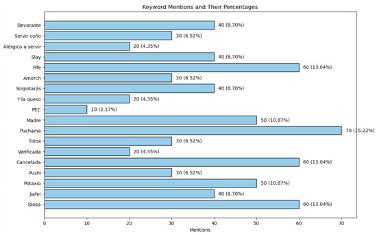 Figure 5 shows the most frequently mentioned keywords, illustrating recurring themes within the Potaxie, Fifes, and Tilinx subcultures. A complete breakdown is available at https://doi.org/10.6084/m9.figshare.26362693 (accessed on 24 July 2024) (pp. 5–6). All coded data, raw metrics, and Python scripts used in the analysis are accessible at https://doi.org/10.6084/m9.figshare.26362960 (accessed on 24 July 2024).