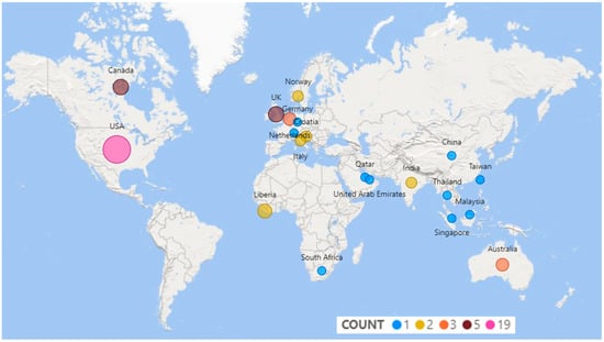 A total of 57 studies met the aforementioned criteria and were deemed eligible for inclusion. Table A1 in Appendix A shows the 57 articles that were included. Most studies (twenty-four) were conducted in North America, eighteen in Europe, nine in Asia, three in Africa and Oceania, and none in South America. The map chart in Figure 1 shows the countries where the studies were conducted, with the size and color of the bubbles indicating the number of studies.