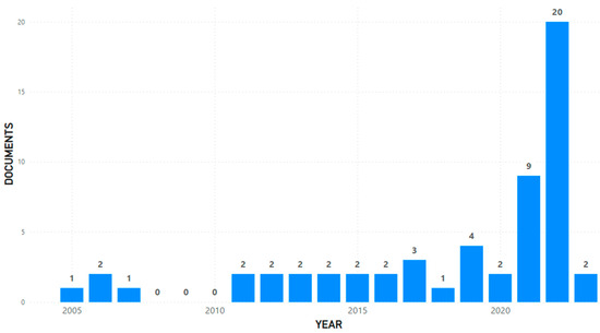 Most studies were published during the COVID-19 pandemic, with more than half (29 out of 57) published in the 2021–2022 period. The column chart in Figure 2 shows the number of published studies per year.