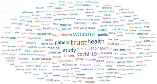 The fifty-seven papers comprise thirty-seven reviews, thirteen quantitative studies, five opinion papers, one letter to the editor, and one qualitative (observational) study. The thirty-seven reviews include twenty narrative reviews, nine systematic reviews, six scoping reviews, one rapid review, and one critical review. The words ‘vaccine(s)’/‘vaccination’ appear a total of 4817 times within the 57 documents. The words ‘health’ (4202), ‘trust’ (3828), ‘Covid’ (2303), and ‘care’/‘healthcare’ (2198) follow in frequency. In the world cloud of Figure 3, the size of each word is proportional to its frequency of occurrence. The cloud also highlights the most frequently occurring terms in the reviewed literature, providing a visual representation of dominant themes. Words such as ‘vaccine(s)’/‘vaccination’, ‘trust’, ‘health’, and ‘COVID’ appear prominently, reflecting the centrality of these topics in the discourse on trust during health crises. The word cloud is helpful for identifying key areas of emphasis within the reviewed literature. For instance, the high frequency of ‘trust’ and ‘mistrust’ underscores their foundational role in shaping public health outcomes. Additionally, the prominence of terms related to specific pandemics (‘COVID’, ‘SARS’, ‘Ebola’) reflects the targeted scope of the review.