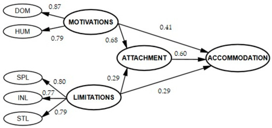As can be observed (Table 5), the total effect (H8) between the constructs “Motivations” and “Accommodation” with the mediating variable “Attachment” was β = 0.82 (p < 0.001), being higher than the direct relationship (H5) between the construct “Motivations” and the construct “Accommodation” (0.41). The same occurred in the total effect (H9) between the constructs “Limitations” and “Accommodation” with the moderator variable “Attachment”, reaching a value of β = 0.46 (p < 0.001), higher than the direct relationship (H7) between the constructs “Limitations” and “Accommodation” (0.29). The model explained 59.7% (R2 = 0.597) of the total variance in the “Accommodation” construct. On the other hand, the different fit indices of this model were adequate: χ2/gl = 2.81, GFI = 0.967, AGFI = 0.955, CFI = 0.978, NFI = 0.968, TLI = 0.963, and RMSEA = 0.033. Figure 2 presents the structural model derived from the research carried out.
