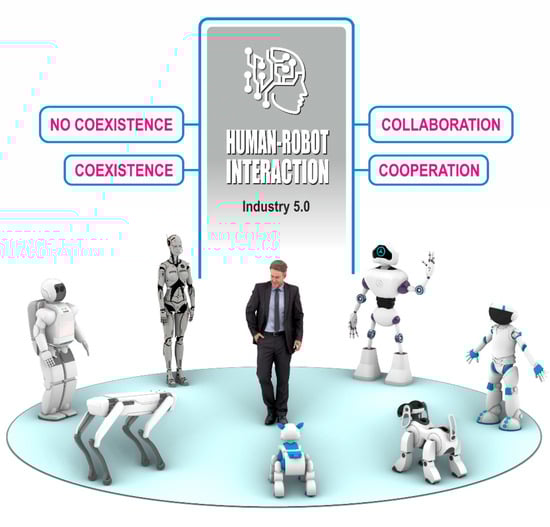 Several previous studies have elucidated the characteristics of the fifth industrial revolution, which explains how humans and robots work synchronously and advance in different areas of human well-being. One of them is the energy revolution [5], a highly transformed workplace culture where robots replace routine tasks [3], and the introduction of collaborative robots [6]. In addition, the fifth industrial revolution will see robots given tasks and decision-making capabilities, primarily aiming to improve quality and production processes. This development represents an outstanding opportunity for synergistic collaboration between humans and, in due course, advanced human–machine systems, fostering a dynamic evolution characterised by unprecedented progress.