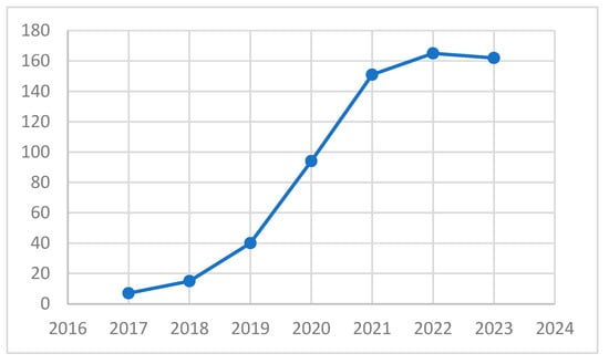 There are several definitions of Society 5.0. As of 30 October 2023, a search for its definition using the query “Society 5.0 is” in Google Scholar yielded more than two thousand results, and Scopus lists about 160 articles published since 2017 (Figure 3). Interestingly, if we set a custom range in Google Scholar to 1900–2015, 173 results are returned that contain the keyword “Society 5.0” as of 12 January 2024.