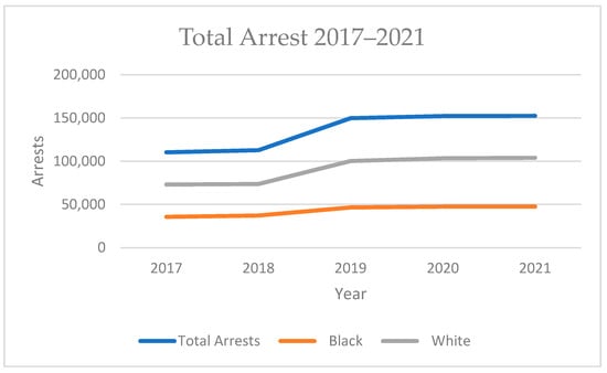 Total Indiana arrest counts for White and Black populations, 2017–2021.