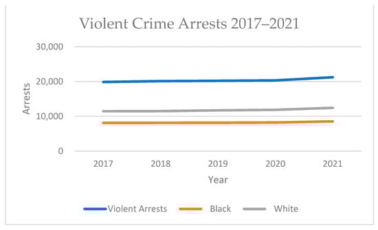 As a unit of analysis, twenty-six counties were examined, which include those with available measures for all control variables1. Each county had racial, sex, and age breakdowns for arrests, but only racial breakdowns were examined for the following offenses: “violent crime” arrests, homicide arrests, assault arrests, and burglary arrests. These crime categories were chosen due to their seriousness and less susceptibility to reporting biases, as well as their focus in prior literature on COVID-19 and crime [,,]. As the reader may recall, violent crimes generally remained stable or increased during COVID-19 based on prior literature, hence our focus on violent crime arrests and homicide here. However, we also examine burglary to provide some analysis of property arrests and to assess whether arrests for burglary in Indiana declined, as shown in some other state analyses [,]. Data on arrests and control variables were gathered from 2017 to 2021.