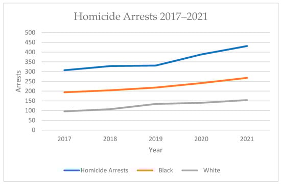 Total Indiana homicide arrest counts for White and Black populations, 2017–2021.