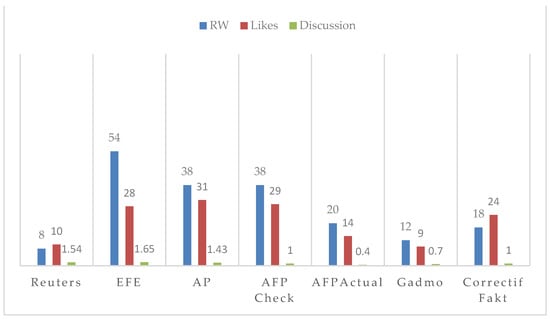The messages issued by the news agencies obtained better results than those issued by the verifiers; their ability to go viral made them reach a higher percentage of users and obtain a higher engagement than those of the verifiers, receiving 8 comments, 74 retweets, and up to 234 more likes. In terms of reproductions, the difference is overwhelming: almost 300,000 in the case of agencies (274,882), compared to 6993 registered by verifiers.