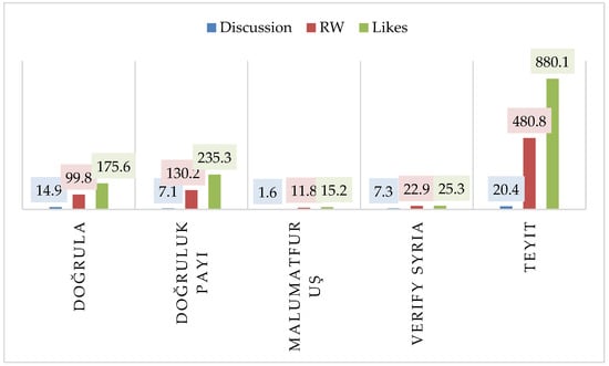In the case of verifiers, the local ones stand out the most, perhaps due to geographical proximity or to the law against disinformation passed in October 2022 by the Turkish government, which imposes restrictions on online news sites and social media platforms (see Figure 2). Thus, Teyit, Doğruluk Payi, and Doğrula’s tweets have the highest number of retweets (481, 130, and 100, respectively), as well as a high number of likes (880, 235, and 176) and a fantastic discussion index, with 20 points in the case of Teyit and 15 in Doğrula. Their reach is also huge, with Teyit’s tweets obtaining 829,724 views, and 701,600 for Doğruluk Payi.