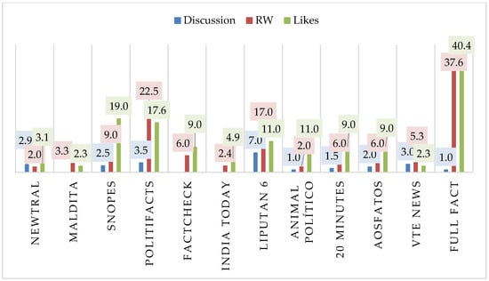 Outside Turkey, Full Fact and Politifact are the verifiers with the highest engagement. The latter also stands out at the debate level, with more than 40 comments received in the case of the British verifier (see Figure 3). They are followed by Liputan6 and Snopes, while the Spanish sites Newtral and Maldita register very low levels of engagement; in fact, the latter does not register any likes. In terms of reach, Politifact again stands out (30,062 views), followed by 20 Minutes and Aos Fatos with 29,705 each.