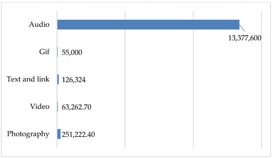 When examining the tables of supporting elements and those related to the reach of the tweets, we observed that messages that include photography or video are those that achieve greater engagement (see Figure 10); however, it is the messages with audio, despite their small number (they do not reach 1%), that have the greatest reach, with more than 13 million reproductions, putting the instant messaging network WhatsApp in the spotlight for its viralizing power of misinformation (see Figure 11).