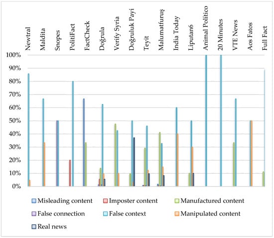 The IFCN consists of 74 organizations, of which we selected 20 (see Table 2), as follows: the 10 with the largest number of followers on X; 5 Syrian and Turkish fact-checkers belonging to the International Network (Teyit, Doğruluk Payi, Doğrula, Malumatfuruş, and Verify Syria); 2 agencies of news verification, Newtral and Maldita Hemeroteca, which are reference projects in the Spanish context and members of the European Fact-Checking Standards Network (EFCSN); and finally, we included Snopes, being the first site dedicated to fact-checking [93,94]; FactCheck.org, the first digital media with professional journalists dedicated to political fact-checking in the USA; and PolitiFact, specialized in combating disinformation since 2007.