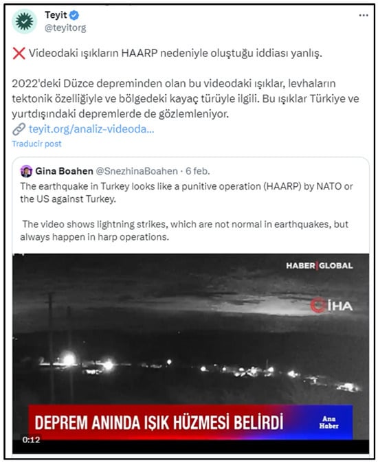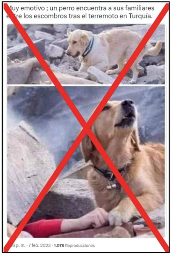 Next in importance is content fabricated with the aim of misleading and harming (23%). This is the case of news stories that alluded to the fact that foreign countries removed their ambassadors from Turkey 24 h before the catastrophe, implying that they knew what was going to happen. There were also false collections for the victims of the earthquakes, behind which phishing intentions were hidden.