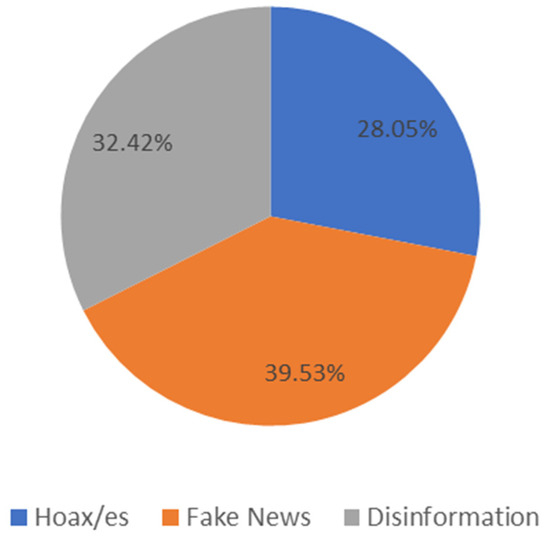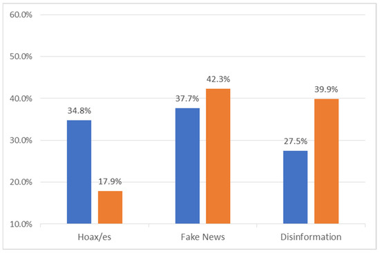 There are also significant differences based on the COVID-19 timeframe (gl 2/χ2 = 0.02). The largest divergences are found with the term hoax/es, which was used nearly twice as often before the pandemic as in the second period (34.8% compared to 17.9%). From 2020 onward, the preferences changed: disinformation, and above all, fake news, were used more often. However, as seen in Figure 3, regarding the term disinformation, the difference before and after the pandemic is greater, as it exceeds 12 percentage points (27.5% before and 39.9% after), while for fake news the difference is just under five points from one timeframe to the next (37.7–42.3%).