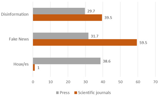 The final sample was n = 732. Of these units of analysis, 527 (71.9%), were from newspapers and 205 (28.1%) from scientific journals. Of the 32 science journals selected, less than half (14, or 43.75%) included one or more of the search terms, “Disinformation”, “Hoax/es” “Fake News”, and “False News”. On the other hand, all the newspapers included one or more of these terms in the headlines of some of their content.