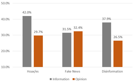 With regard to the search term, a balance can be seen with fake news regarding percentages that barely differ by nine tenths of one percent (31.5% in Information and 32.4% in Opinion). However, as shown in Figure 7, there is a clear tendency for Information pieces to use hoax/es in their headlines as opposed to Opinion pieces, which tend to use the term disinformation.